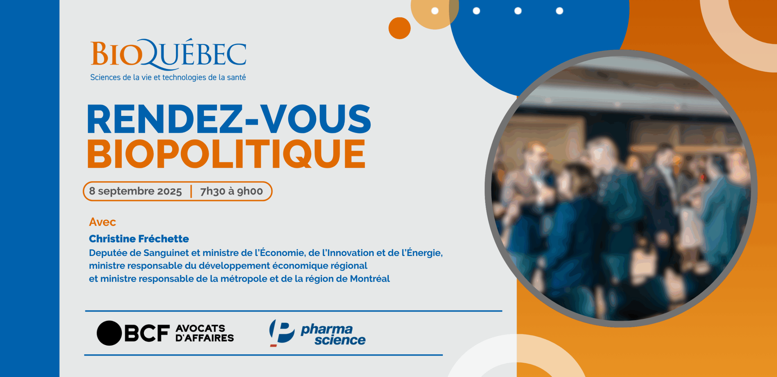 Nous avons le plaisir de vous inviter au Rendez-vous BIOPolitique organisé par BIOQuébec, qui se tiendra le 8 septembre prochain dans les bureaux de BCF avocats d’affaires. Cet événement, sous forme de conférence avec réseautage, sera l’occasion d’un échange avec la ministre Christine Fréchette sur sa vision et l’avenir de notre secteur.